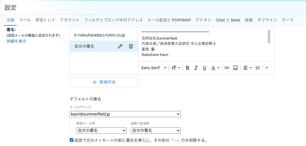 署名の編集欄は使いにくいので、別途テキストエディタ(私はmiを愛用しています)で作成してから貼り付けるのがおすすめ。